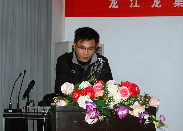 首届“龙江龙班”学生、我院机械5103班同学李晓剑上台发言。他代表全体“龙江龙班”的同学向龙江龙集团及朱利军董事长捐资助学的义举表示感谢,并表示将珍惜机会,勤奋学习,利用有利平台接触企业和社会,提升实践动手能力和创新能力;将立足本位,勤于思考,认真工作,为企业发展和地方经济建设贡献力量。