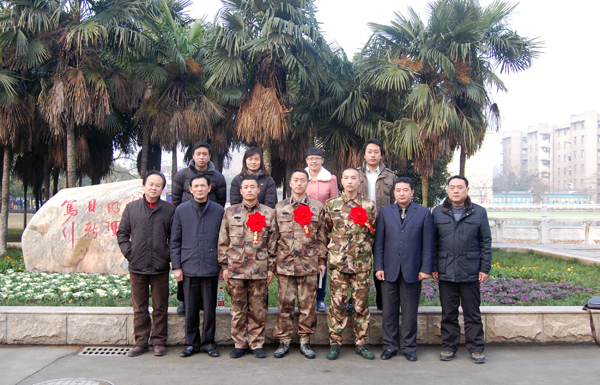 袁先海与学工处主任彭中共同为三名同学赠送了纪念品,并与大家亲切交谈。与会领导与应征入伍的同学在泮池旁合影留念。