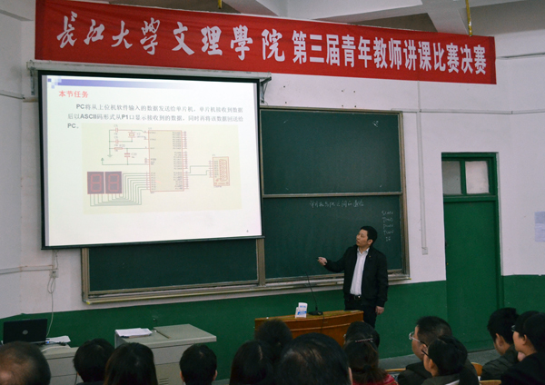 万正兵老师第一个登上讲台,与学生们互致问候后,在轻松愉快的氛围中步入正题:“同学们,今天我们要学习的内容是‘单片机与PC之间的通信’,接下来我将带领大家一同学习与探讨。”他一边说着,一边播放PPT演示相关内容,还不时结合实际向学生提问,学生们听得津津有味,踊跃回答问题,万老师针对问题给予了细致的解答。
