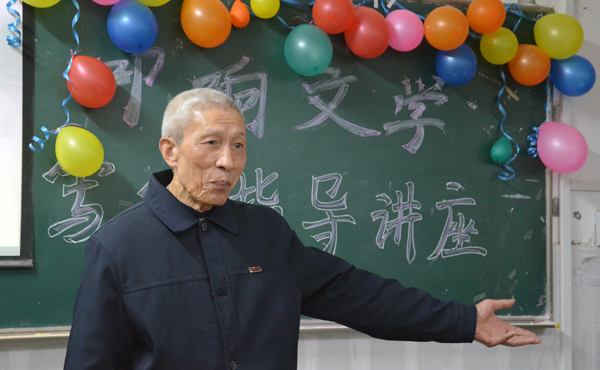 年过古稀的荆州著名诗人赵昌炳浅析了古体诗和自由诗的区别,并对同学们提出了殷切期望。他希望同学们在诗歌创作的道路中,不要带着过于沉重的手链脚铐,充分发挥思想的自由度,多看书多积累,争取把中国的文字驾驭得活灵活现。