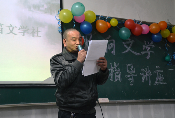 高山松说,希望能和爱好文学的同学一起叩响文学这扇门,叩响文学这个梦,坚持在这个梦中永远不要醒来,将其视作一种信仰,当成一种寄托。高山松还对同学们写的诗歌做了点评,肯定了同学们的文字功底,同时也指出了字里行间的不足。