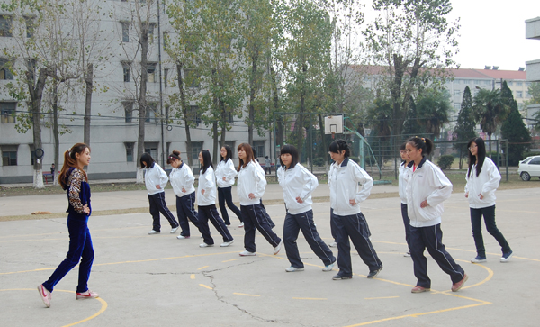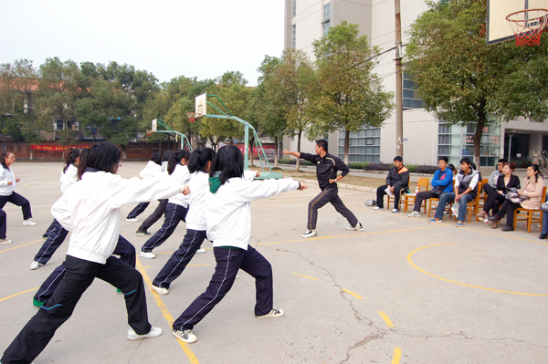 “同学们,注意看我这个动作,这个招式叫做野马分鬃,我们先在屈膝按掌的基础上,手呈抱球状收回左脚,再像这样,转身上步!”体育老师鲁斌正在篮球场上教学生太极拳,一边解说一边示范,学生们都聚精会神地跟着老师做着动作。
