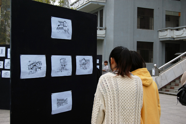悠远朦胧的远山近水,安详质朴的古镇建筑,秀丽挺拔的修竹直柏,这些美景一一通过作者细腻的笔触,展现在画纸上。出展不到半个小时,便引得众多师生驻足观赏。