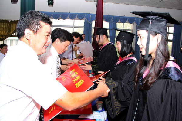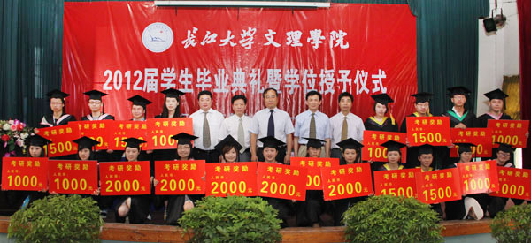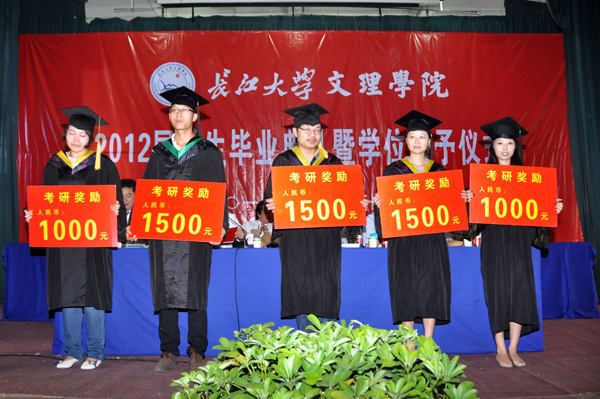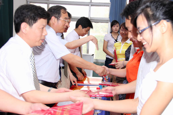 我院今年共有1800余名本专科毕业生圆满完成学业,其中70名毕业生顺利考取研究生。仪式上,副院长郭睦庚宣读了《关于准予伍倩等1761名2012届本专科生毕业的决定》,党委副书记汪邦柱宣读了《关于对考取2012年硕士研究生的同学予以表彰奖励的决定》,院长沈光明、党委书记袁先海、常务副院长王金琼分别为优秀毕业生代表颁发毕业证书、优秀毕业生奖状和奖金。