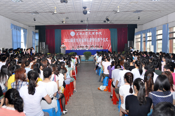 本网讯(记者刘磊 周芳)合欢花开,夏荷染碧,又是一年毕业季。6月21日上午,我院在工会大厅举行2012届学生毕业典礼暨学位授予仪式。院领导沈光明、袁先海、王金琼、郭睦庚、汪邦柱出席毕业典礼,我院学位评定委员会委员、毕业生代表、校友等近千人参加典礼。毕业典礼由常务副院长王金琼主持。