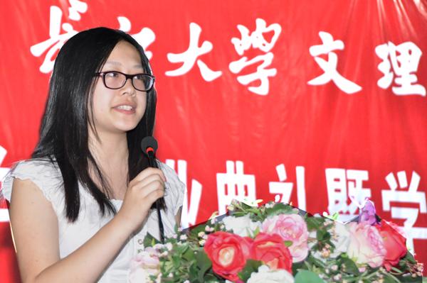 大家好!我是管理学部会计5083班的祝薇,很荣幸能代表2012届毕业生在这里发言。首先,请允许我代表全体毕业生向辛勤培育我们的母校及亲爱的老师们致以最诚挚的感谢和最崇高的敬意!谢谢你们,老师们,你们辛苦了!
