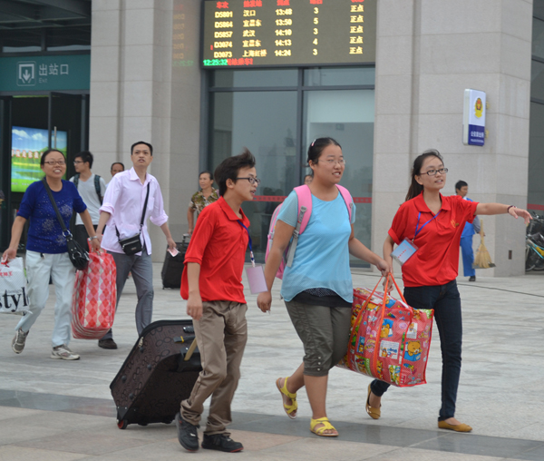本网讯(学生记者 史景宏)8日早上8点11分,从北京西直达宜昌东的Z3列车到达荆州火车站,站前的志愿者们也都忙碌起来,站在出站口举着引导牌,等候来我院报到的新生。