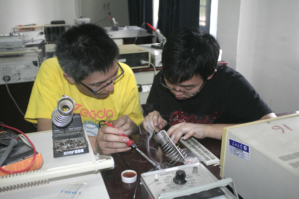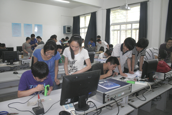 本网讯(学生记者 张珊珊)5月17日下午,在我院创新实验室,第六届“泮池五月风”电子产品设计与制作大赛正在紧张进行中。当天,全院各专业的159名学生参加了此次比赛。同学们每3人一组,以团队竞赛的形式进行比赛。刘美林、李相敏、万正兵、潘小红和张立新老师担任大赛评委。