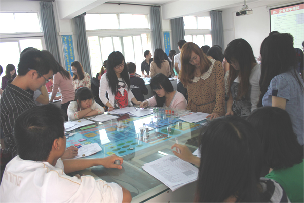 针对竞赛项目,培训内容为沙盘企业模拟经营和信息化实战,分讲解-实践-讨论3个环节。60个团队近300名学生接受了培训。