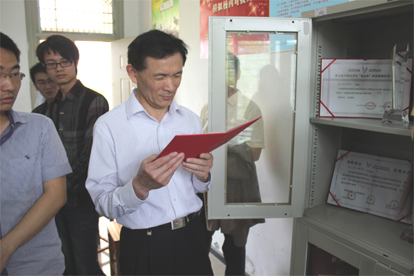 在ERP沙盘模拟实验室,大赛指导老师张菊向院领导介绍了培训工作的进程。院党委书记袁先海仔细观看了荣誉展示柜,对学生取得的成绩表示欣慰和赞许,勉励同学们在荣誉的激励下再接再厉,蝉联魁首,创造辉煌。