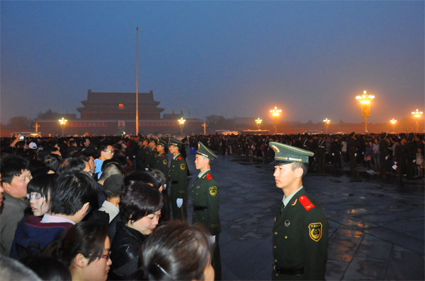 清晨四点半,距升旗仪式近50分钟时,天安门广场上晨曦微露,人流涌动。同学们注视着国旗升起的方向,等待庄严时刻的到来。