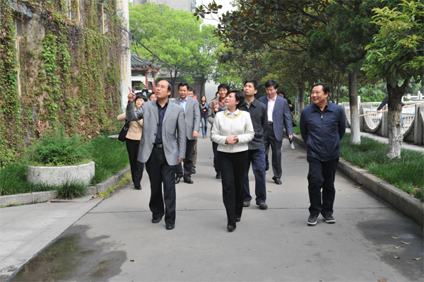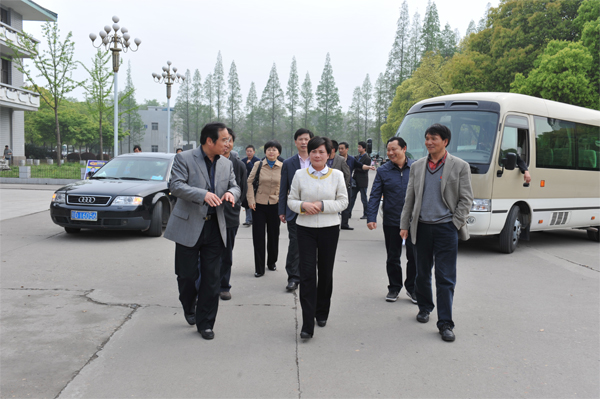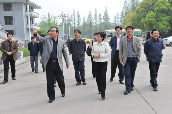 荆州市委副书记雷文洁(前排中)在长江大学党委书记张忠家(右一)、副校长张万明(后排右一)、我院院长沈光明(左一)陪同下参观校园。