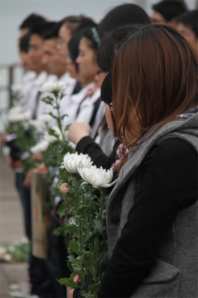 第一批是“长江人链”英雄大学生的10名代表。第二批是校党委宣传部长徐波、英雄班级班主任和热心市民为代表的祭奠人群。