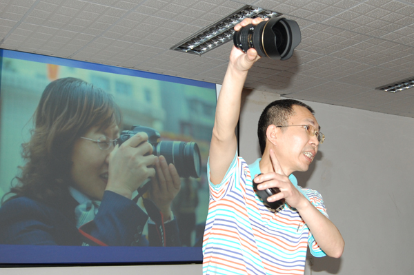 讲座内容丰富,课堂氛围活跃。汤波副教授从摄影的基本理论切题,启发学生对摄影的认识,讲授了器材的选择及对光线、背景、气氛、环境等技术的基本运用。他以大量实地拍摄的新闻图片为例,向学生强调了主题和思想内涵的灵魂作用。