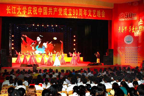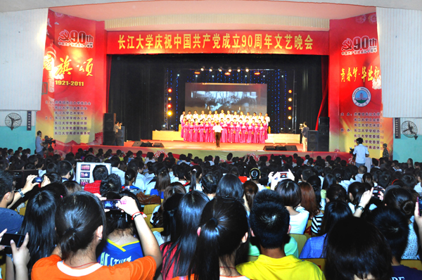 本网讯(学生记者 李立科)6月19日晚,为庆祝中国共产党成立90周年,一场主题为“党旗颂”的大型文艺晚会在东校区大礼堂隆重上演。校领导张忠家、张昌民、朱业宏、张玉清、刘在洲、李家宝、张万明、郭海敏、蒋光忠、谢云、周从标、刘绍平出席晚会现场。我院党委书记袁先海、党委副书记汪邦柱参加了晚会。