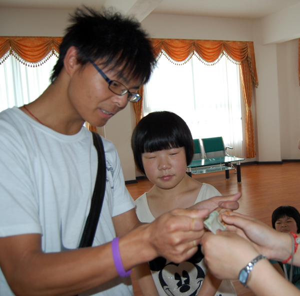 在福利院活动中心,刘腾飞等同学为孩子们带来精彩的魔术表演《魔力卡片》和《魔幻橡皮筋》,大家都抢着要上台和他互动,刘腾飞也现场当老师,教大家变魔术。
