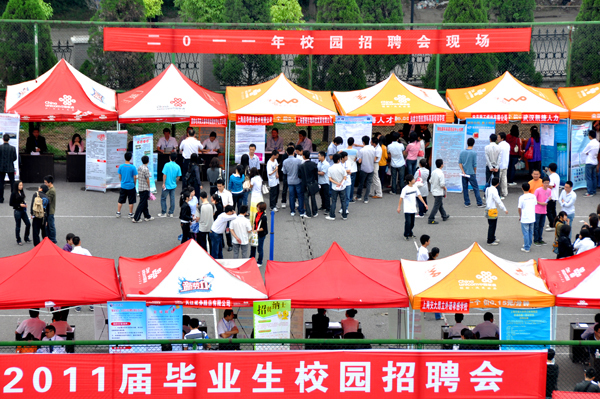本网讯(记者 刘磊 学生记者 刘小芹)5月14日,我院2011届毕业生招聘会在学院体育场举办。来自长三角、珠三角、中部省市共计48家企业前来我院选才,为应届毕业生提供了2369个就业岗位。院领导沈光明、王金琼、郭睦庚亲临招聘会现场,深入用人单位和毕业生中详细了解招聘情况。学工处、各学部及相关部门负责人陪同。