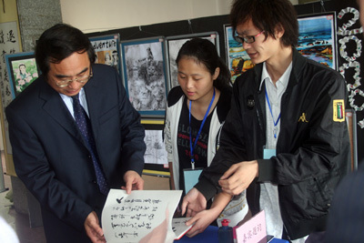 活动展出现场,学院院长沈光明、院党委副书记汪邦柱及荆州市书法协会资深会员杨风子一行,就本次大赛的重要意义进行了深入交流,沈院长强调,“一年一度的书法绘画大赛是学院泮池五月风科技文化节的重要组成部分,学院鼓励同学们参加类似活动,对提升同学们自身多才多艺的综合文化素质,塑造同学们高雅的道德情操有着重要意义。”观看展出结束,沈院长砚墨提笔为本次活动赠送了“书写美丽”四个字。