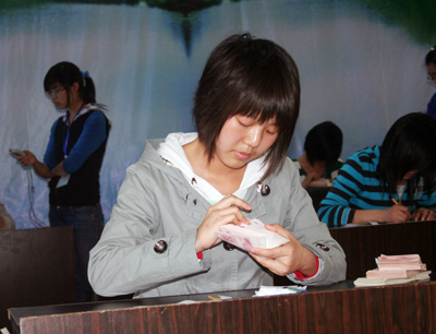 经过两次点钞专门化辅导,顺利通过初赛的45名同学已基本具备了比较全面的点钞技能,掌握了单指与多指点钞的手法与技巧,都在等待一个全新的检验时机。决赛现场,比赛还没开始,现场已是一片热闹繁忙的景象。各入围选手跃跃欲试,拿着点钞券进行赛前练习,准备在赛场上一显身手。裁判长一声令下,比赛开始,来自管理学部会计5082班的小张迅速往“柜台”前一坐,左手迅速地从桌上拿起道具钞票夹在中指与无名指间,右手不停地拨动,全神贯注地点钞。其他参赛选手或选择单指单张点钞,或多指多张点钞,现场一片紧张气氛,“选手们娴熟的专业技能,看得我眼睛都花了。”现场一名观众感叹道。
