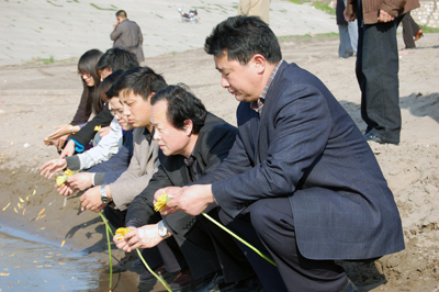 下午5时许,大家手持黄色的菊花来到宝塔湾,“人链”纪念碑旁已摆满了菊花,大家先后在纪念碑前合影留念。随后,教职工们有秩序地走到江边,持着花,全部低下了头,在心中默默哀悼,以一种无言的方式表达了对三位英雄最深切的缅怀,大家对着滔滔江水,洒下了一片片金黄的菊花花瓣,花瓣随着江水愈流愈远,也带去了教职工们对三位英雄们最真切的怀念与祝福。