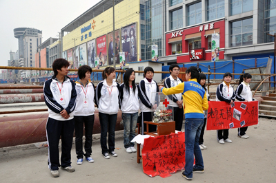 “青海玉树发生7.1级地震,请大家献点爱心吧。”每当有人群经过,募捐点的同学们便齐声说道。募捐点前的宣传板上一张张地震灾区悲戚的图片吸引着来往的路人,许多人站在宣传板前久久不愿离去,一位大约五六岁的小女孩从家长手中接过零花钱,以一种虔诚的样子,带着为灾区人们祈福的表情,将钱小心翼翼地投入捐款箱中。路人们也纷纷捐出爱心款,将10元、50元的爱心款投入捐款箱。