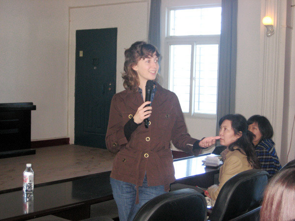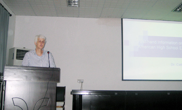 威特博士以一句亲切的问候作为开场白,结合自己的从教经历,她指出,美国教育非常注重创造性思维的培养,给学生自由空间,这样有利于学生的多样性发展,培养综合素质,但在体育锻炼方面,美国需要借鉴中国经验。威特博士还介绍了美国五种类型的教育模式,公立大学、私立大学、教会大学、公立社区大学、家庭教学等,她用身边的事例为同学们详细讲解了家庭教学模式。