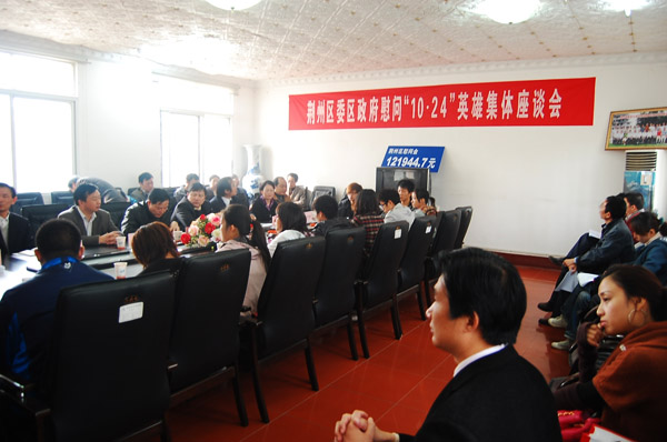 本网讯(学生记者 严帅)11月7日,荆州区委区政府慰问10·24英雄群体座谈会在学院会议室召开,区委书记张震龙、区长吴祖云一行及长江大学副校长李家宝,学院院长沈光明、党委书记袁先海出席了本次座谈会,荆州电视台、江汉商报等校外媒体参加了座谈会,座谈会由学院党委副书记汪邦柱主持。 座谈会上,区委书记张震龙对英雄群体舍己救人的伟大精神表示了充分的肯定,并鼓励他们在今后的学习生活中能够坚强的站起来。 长江大学副校长李家宝则告诫13位英雄群体,希望他们不要在如潮的采访和表扬中迷失自我。 随后,荆州区委政府向三位英雄家属分别送上了2万元慰问金,向13位英雄分别送上5000元慰问金。 (摄影 严帅) (责任编辑 周芳)
