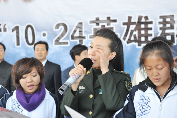 “10·24”英雄集体中生还的11名大学生,在舞台上站成一排,眼含泪水,与谭晶手拉着手,共同唱响英雄赞歌。