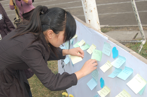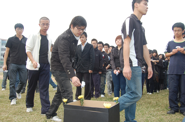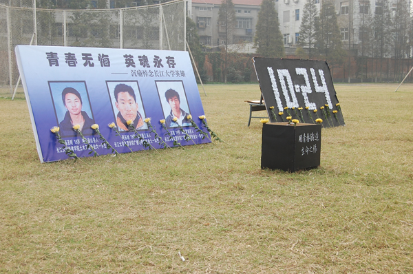 □学生记者 严帅 陈及时,长大城建学院土木工程专业大一学生。 何东旭,学院广播电视学专业大一学生。 方 招, 学院广播电视学专业大一学生。 正是这三个“90后”的学生,让所有人为他们的英雄壮举而致敬!正是这来自广电专业和土木工程专业的三个学生,让整个中国为之感动!作为他们师兄师姐们,我院08、07、06级广电专业的同学们为他们师弟奋不顾身、不怕牺牲的英雄气概所深深打动。 29日下午1点,学院足球场西南角,一百多名广电专业的同学们,身着黑色上衣,胸前佩戴一朵小白花,表情肃穆,面对宝塔河的方向,为他们的师弟、他们那两个或许还没有见过面的师弟——何东旭、方招及长大的陈及时举行了简单而又庄重的追悼仪式。 仪式中,“我宁愿你们默默无闻的活着”、“你们永远活在我们广电专业人的心中”、“学弟,你们是最棒的,一路走好!”一张张温馨而又美好的祝福小字条贴满了整个留言板。“尽管我们点了蜡烛为他们祈祷,放了孔明灯为他们祝福,但这还远远不够,远远不能够表达我们作为广电人对英雄的敬意。”鲁文博同学满怀深情的声音让在场所有人再次为英雄们的无畏、英勇、大爱而动容,现场不少女生眼圈已经湿润。 来自广电5071班的王美龄同学是流着眼泪离开追悼会现场的,她告诉记者,她是第一次这么近距离感受到英雄的伟大,而且这次事件主角竟是自己的师弟,她为他们年轻生命的逝去感动遗憾,为他们美好青春的结束而痛心,更为他们这种英雄壮举感动骄傲和自豪。追悼会结束后,广电专业的同学们手捧菊花,带着学院师生的祝福来到事发地点长江宝塔河段,祭拜他们的英雄师弟,望他们一路走好。 (摄影 张浩生 郑义) (责任编辑 周芳)