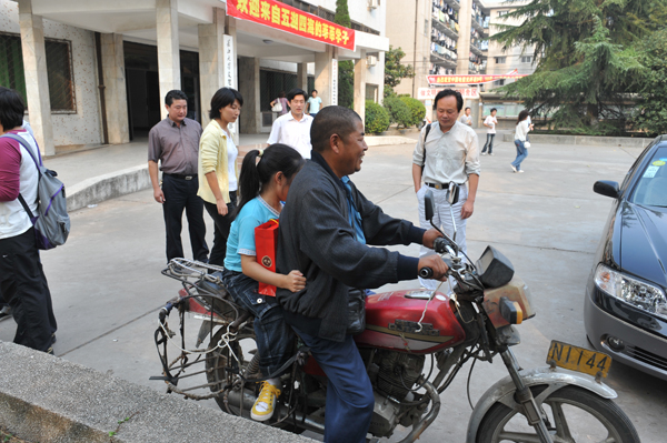 在基础学部办公室,来自会计5091班的曾婷婷被一片温情包围着。由于先天性佝偻病,身材矮小的她生活无法自理,每天由母亲骑三个小时的自行车送其上下学,开学后,该班班委成立了“爱心小组”,由团支书郇雅琪和陈尽轩同学负责背着曾婷婷进教室学习。据该班主任邱凤霞老师介绍,曾婷婷学习优秀,也是班上最勤奋的学生,她这种顽强拼搏精神也激励着身边的每一位同学。