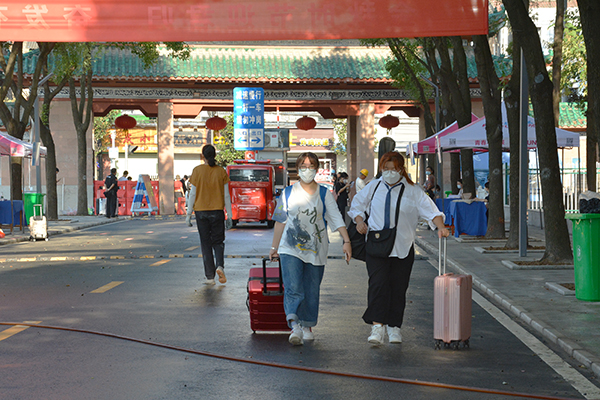 间隔1米排队等候、消毒行李、核验证件和健康码、检测体温……各项检疫措施细致严格,由学院辅导员、相关部门人员组成的工作队伍,操作有条不紊,现场秩序井然。
