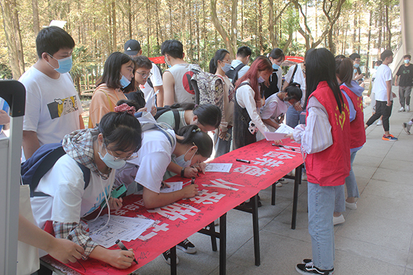 本网讯(通讯员 张宇琼)9月17至18日,管理系组织开展了拒绝餐饮浪费系列主题活动,引导师生从点滴做起,减少餐饮浪费,践行绿色生活,弘扬勤俭节约传统。 9月17日,各班以班会的形式开展线上主题学习,在辅导员的带领下,同学们集中学习了习近平总书记关于制止餐饮浪费行为的重要指示精神,观看了《焦点访谈》相关节目,并畅谈学习感悟,交流心得体会。18日,一批大学生志愿者自发组织主题签名活动,在印有相关内容的横幅上,师生纷纷签字承诺,将树立勤俭节约的生活理念,从我做起,拒绝餐桌浪费,文明用餐。 (图片由管理系提供) (责任编辑 刘磊)