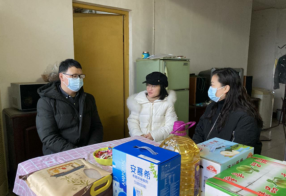 本网讯 春节将至,学院工会认真开展调查摸底工作,了解掌握因疫情未返乡回家过年教职工的基本情况。经了解,来自河北邯郸的设计系教师冯亚丽,今年积极响应当地政府号召,就地过年,目前租住在西校区。2月7日上午,党委副书记孙细望、工会主席王玲玲、设计系党总支书记许梦怡一行来到冯亚丽家,送去新春慰问品和温馨的祝福。冯亚丽表示,非常感谢学院的亲切关怀,虽然自己没有回老家,但感受到了文理学院大家庭的温暖,也祝愿学院未来发展越来越好。记者 周芳 通讯员王玲玲 摄影报道 (特约编辑 李波涛)