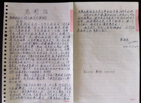本网讯(记者 周芳)“真是感谢williamhill官网的学生们,这样崇高的人格和思想品德就是在这样的好学校培养的啊!”6月20日清晨,蔡莉萍将一封沉甸甸的感谢信送到外语系办公室,发出这样的感叹。