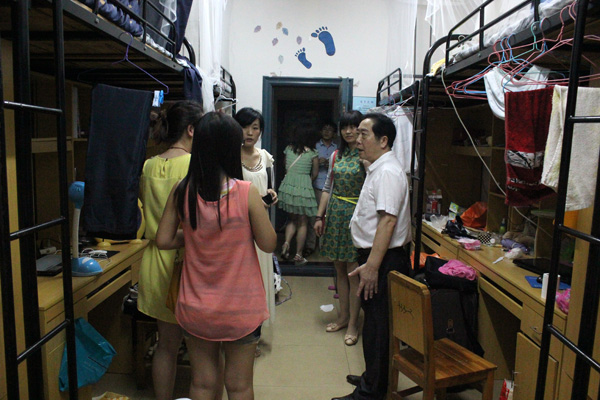 本网讯(通讯员 言行)6月18日晚,我院工商管理系和外语系学工主任、团总支书记、毕业班辅导员在系主任的带领下,一起深入寝室看望和送别毕业生,为即将离校的同学送上殷切嘱咐和真诚祝福。