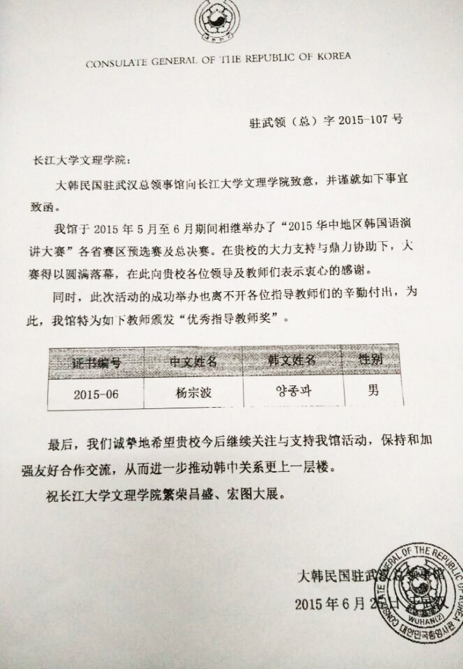 本网讯(通讯员 吴立娜)近日,学院办公室收到大韩民国驻武汉总领事馆致我院的感谢函,致谢我院对“2015华中地区韩国语演讲大赛”的大力支持与鼎力协助。