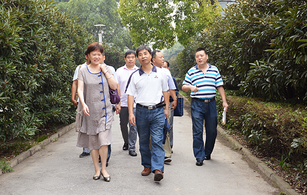 郭睦庚(前排右)等陪同省教育厅检查组成员刘丽萍(前排左)、潘铮东(二排右)实地考察