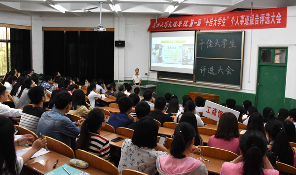 本网讯5月19日下午,我院开展首届“十佳大学生”评选活动,来自各系的18名优秀学生通过PPT,汇报个人的先进事迹及学习感悟,充分展示个人风采。