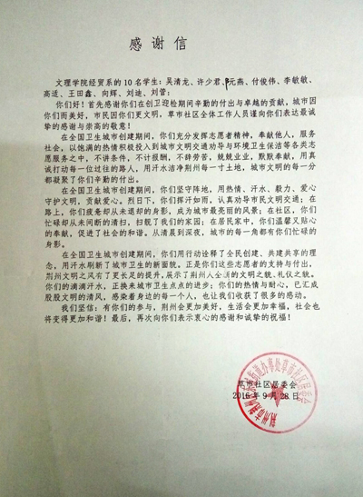 本网讯(记者 吴秀丽)今天(9月30日),我院经济与贸易系收到一封来自荆州区东城街道办事处草市社区居委会的感谢信,对该系吴清龙、许少君等10名青年志愿者表示感谢。